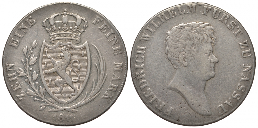 Нассау 1 талер 1811 СТ, Фридрих Вильгельм (1788-1816) KM 33b, Jaeger 26, Thun 222, AKS 32, Kahnt 303 серебро 00-000-00