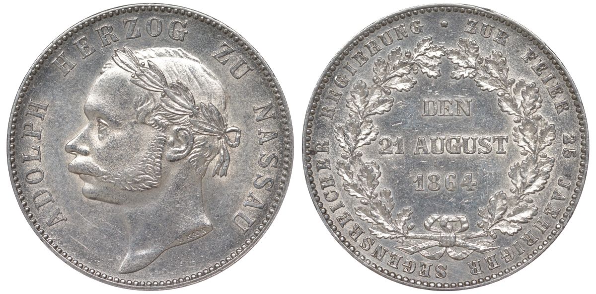 Нассау 1 талер 1864 на 25 лет правления герцога Адольфа Jaeger 63, Thun 238, AKS 77, Kahnt 316, Davenport 750 серебро 00-806-47