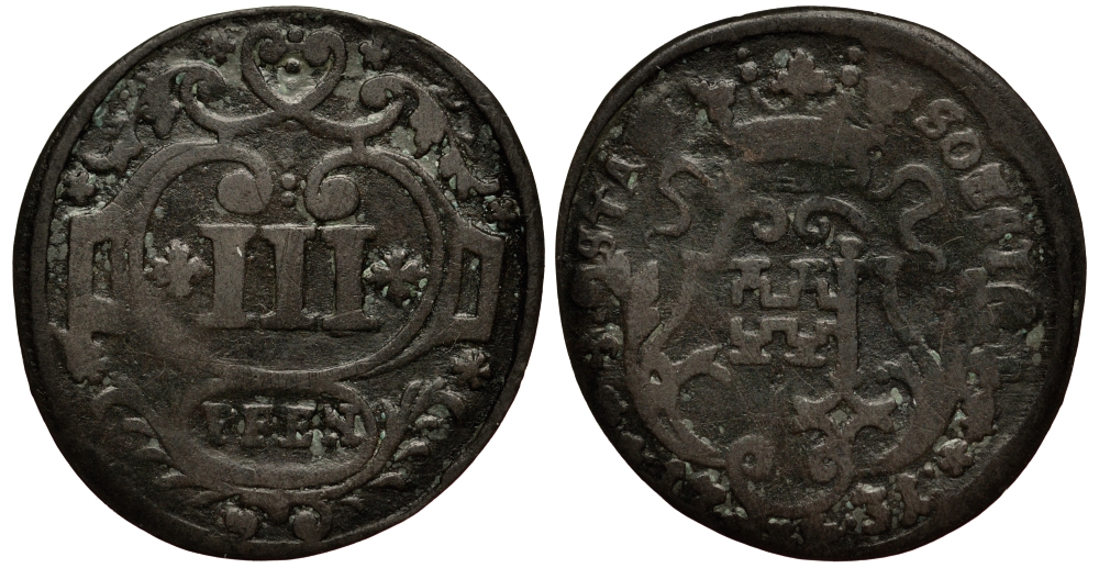-Соест 3 пфеннига 1731 KM 27 медь 413-2734Другие землиАнгальт - AnhaltСаксен-Кобург-Гота - Sachsen-Coburg-GothaЮлих-Берг - JulichbergЭйхштадт - EichstattШтольберг - StolbergШпеер - SpeyerШварцбург - SchwarzburgШамбург - SchaumburgФранкфурт - FrankfurtСилезия - SchlesienСаксония - SachsenБерг - BergПадерборн - PaderbornШаумбург - SchaumburgИзенбург - IsenburgПомерания - PommernМайнц - MainzОснабрюк - OsnabruckЭмден - EmdenЭрфурт - ErfurtАхен - AachenВисмар - WismarВид - WiedМекленбург - MecklenburgРейс - ReussГослар - GoslarГанновер - HannoverАугсбург - AugsburgБавария - BayernБаден - BadenБамберг - BambergБранденбург - BrandenburgБрауншвейг - BraunschweigБремен - BremenВальдек - WaldeckВестфалия - WestfalenВормс - WormsВюртемберг - WurttembergВюрцбург - WurzburgГамбург - HamburgРосток - RostockГессен - HessenЙевер - JeverЛевенштайн - LwensteinЛиппе - LippeЛюбек - LubeckМансфельд - MansfeldМюнстер - MunsterНассау - NassauНюрнберг - NurnbergОльденбург - OldenburgПруссия - PreussenПфальц - PfalzРегенсбург - Regensburg