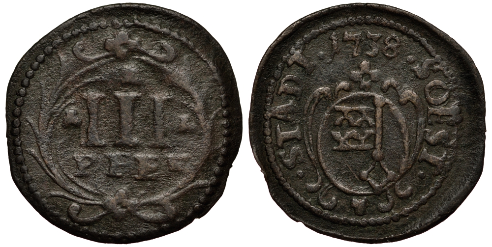 -Соест 3 пфеннига 1738 KM 24 медь 413-2922Другие землиАнгальт - AnhaltСаксен-Кобург-Гота - Sachsen-Coburg-GothaЮлих-Берг - JulichbergЭйхштадт - EichstattШтольберг - StolbergШпеер - SpeyerШварцбург - SchwarzburgШамбург - SchaumburgФранкфурт - FrankfurtСилезия - SchlesienСаксония - SachsenБерг - BergПадерборн - PaderbornШаумбург - SchaumburgИзенбург - IsenburgПомерания - PommernМайнц - MainzОснабрюк - OsnabruckЭмден - EmdenЭрфурт - ErfurtАхен - AachenВисмар - WismarВид - WiedМекленбург - MecklenburgРейс - ReussГослар - GoslarГанновер - HannoverАугсбург - AugsburgБавария - BayernБаден - BadenБамберг - BambergБранденбург - BrandenburgБрауншвейг - BraunschweigБремен - BremenВальдек - WaldeckВестфалия - WestfalenВормс - WormsВюртемберг - WurttembergВюрцбург - WurzburgГамбург - HamburgРосток - RostockГессен - HessenЙевер - JeverЛевенштайн - LwensteinЛиппе - LippeЛюбек - LubeckМансфельд - MansfeldМюнстер - MunsterНассау - NassauНюрнберг - NurnbergОльденбург - OldenburgПруссия - PreussenПфальц - PfalzРегенсбург - Regensburg