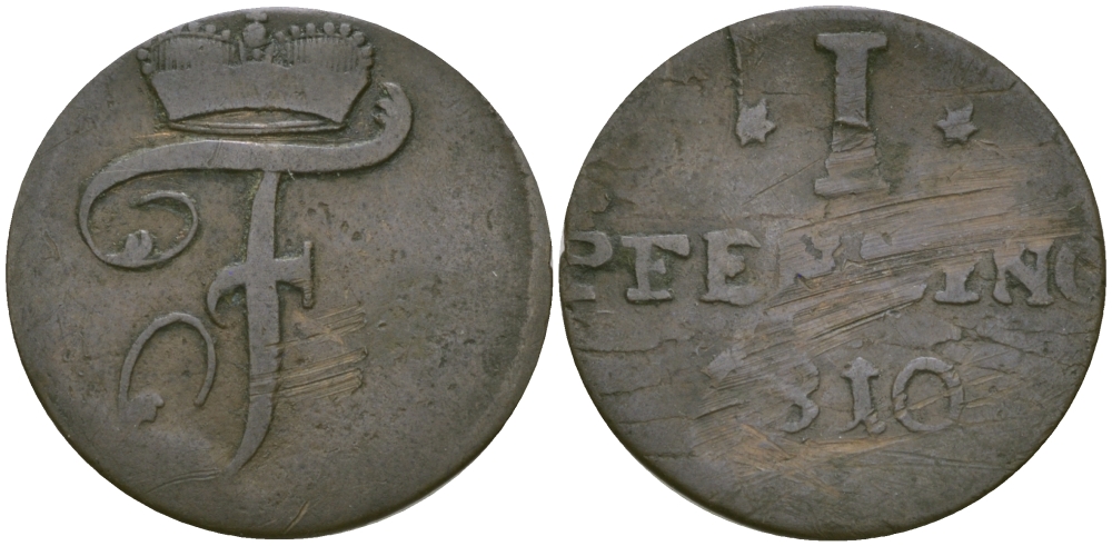Вальдек-Пирмонт 1 пфенниг 1810 FW, монограмма F KM 42b медь 99-769