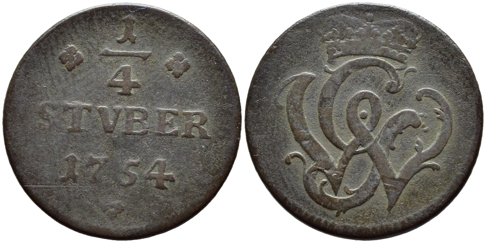 Вид, Рункель 1/4 штюбера 1754 монограмма GW KM 3 медь 84-424
