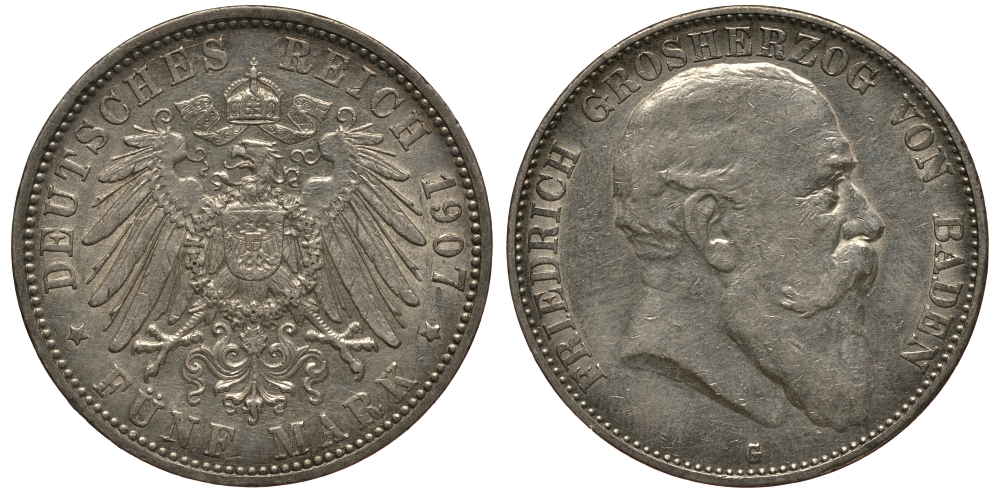-Баден 5 марок 1907 G, Фридрих I (1856-1907) Weege 31, J. 33, KM 274 серебро 3711-1615Пруссия - PreussenразноеРейс - ReussСаксен-Алтенбург - Sachsen-AltenburgСаксен-Веймар-Айзенах - Sachsen-Weimar-EisenachСаксен-Кобург-Гота - Sachsen-Coburg-GothaСаксен-Майнинген - Sachsen-MeiningenСаксония - SachsenШаумбург-Липпе - Schaumburg-LippeШварцбург - SchwarzburgАнгальт - AnhaltМекленбург-СтрелицОльденбург - OldenburgМекленбург-Шверин - Meklenburg-SchwerinЛюбек - LubeckЛиппе - LippeГессен - HessenГамбург - HamburgВюртемберг - WurttembergБремен - BremenБрауншвейг-Люнебург - Braunschweig-LuneburgБавария - BayrenОбщегерманские номиналы