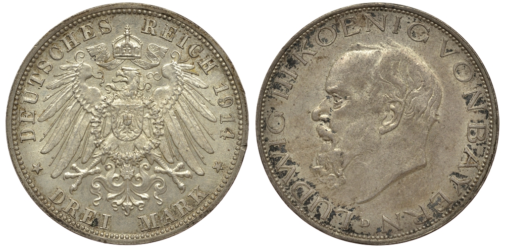 -Бавария 3 марки 1914 D, Людвиг III (1913-1918) Weege 52, J. 52, KM 520 серебро 413-5713Пруссия - PreussenразноеРейс - ReussСаксен-Алтенбург - Sachsen-AltenburgСаксен-Веймар-Айзенах - Sachsen-Weimar-EisenachСаксен-Кобург-Гота - Sachsen-Coburg-GothaСаксен-Майнинген - Sachsen-MeiningenСаксония - SachsenШаумбург-Липпе - Schaumburg-LippeШварцбург - SchwarzburgАнгальт - AnhaltМекленбург-СтрелицОльденбург - OldenburgМекленбург-Шверин - Meklenburg-SchwerinЛюбек - LubeckЛиппе - LippeГессен - HessenГамбург - HamburgВюртемберг - WurttembergБремен - BremenБрауншвейг-Люнебург - Braunschweig-LuneburgБаден - BadenОбщегерманские номиналы