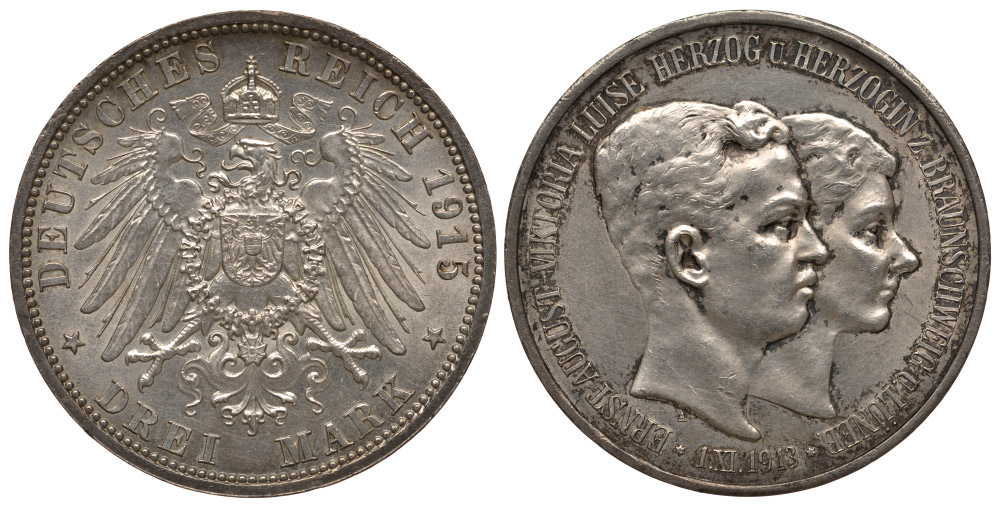 -Брауншвейг-Люнебург 3 марки 1915 А, свадьба Эрнста Августа и Виктории Луизы Weege 56, J. 57, KM 1162 серебро 00-806-33Пруссия - PreussenразноеРейс - ReussСаксен-Алтенбург - Sachsen-AltenburgСаксен-Веймар-Айзенах - Sachsen-Weimar-EisenachСаксен-Кобург-Гота - Sachsen-Coburg-GothaСаксен-Майнинген - Sachsen-MeiningenСаксония - SachsenШаумбург-Липпе - Schaumburg-LippeШварцбург - SchwarzburgАнгальт - AnhaltМекленбург-СтрелицОльденбург - OldenburgМекленбург-Шверин - Meklenburg-SchwerinЛюбек - LubeckЛиппе - LippeГессен - HessenГамбург - HamburgВюртемберг - WurttembergБремен - BremenБаден - BadenБавария - BayrenОбщегерманские номиналы