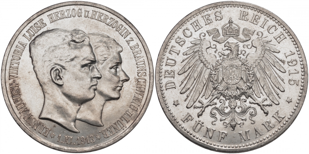 -Брауншвейг-Люнебург 5 марок 1915 А, свадьба Эрнста Августа и Виктории Луизы Weege 58, J. 58, KM 1164 серебро UNC 10-002-65Пруссия - PreussenразноеРейс - ReussСаксен-Алтенбург - Sachsen-AltenburgСаксен-Веймар-Айзенах - Sachsen-Weimar-EisenachСаксен-Кобург-Гота - Sachsen-Coburg-GothaСаксен-Майнинген - Sachsen-MeiningenСаксония - SachsenШаумбург-Липпе - Schaumburg-LippeШварцбург - SchwarzburgАнгальт - AnhaltМекленбург-СтрелицОльденбург - OldenburgМекленбург-Шверин - Meklenburg-SchwerinЛюбек - LubeckЛиппе - LippeГессен - HessenГамбург - HamburgВюртемберг - WurttembergБремен - BremenБаден - BadenБавария - BayrenОбщегерманские номиналы