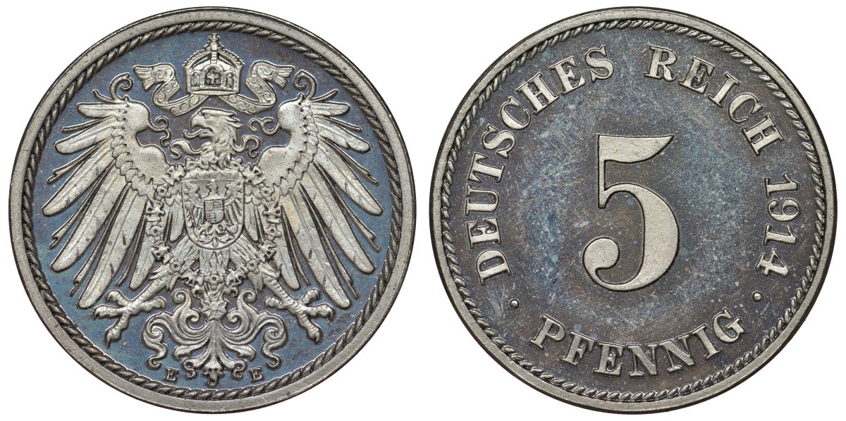 -Германия 5 пфеннигов 1914 E, KM 11, J. 12 медно-никель PROOF 00-806-25Пруссия - PreussenразноеРейс - ReussСаксен-Алтенбург - Sachsen-AltenburgСаксен-Веймар-Айзенах - Sachsen-Weimar-EisenachСаксен-Кобург-Гота - Sachsen-Coburg-GothaСаксен-Майнинген - Sachsen-MeiningenСаксония - SachsenШаумбург-Липпе - Schaumburg-LippeШварцбург - SchwarzburgАнгальт - AnhaltМекленбург-СтрелицОльденбург - OldenburgМекленбург-Шверин - Meklenburg-SchwerinЛюбек - LubeckЛиппе - LippeГессен - HessenГамбург - HamburgВюртемберг - WurttembergБремен - BremenБрауншвейг-Люнебург - Braunschweig-LuneburgБаден - BadenБавария - Bayren