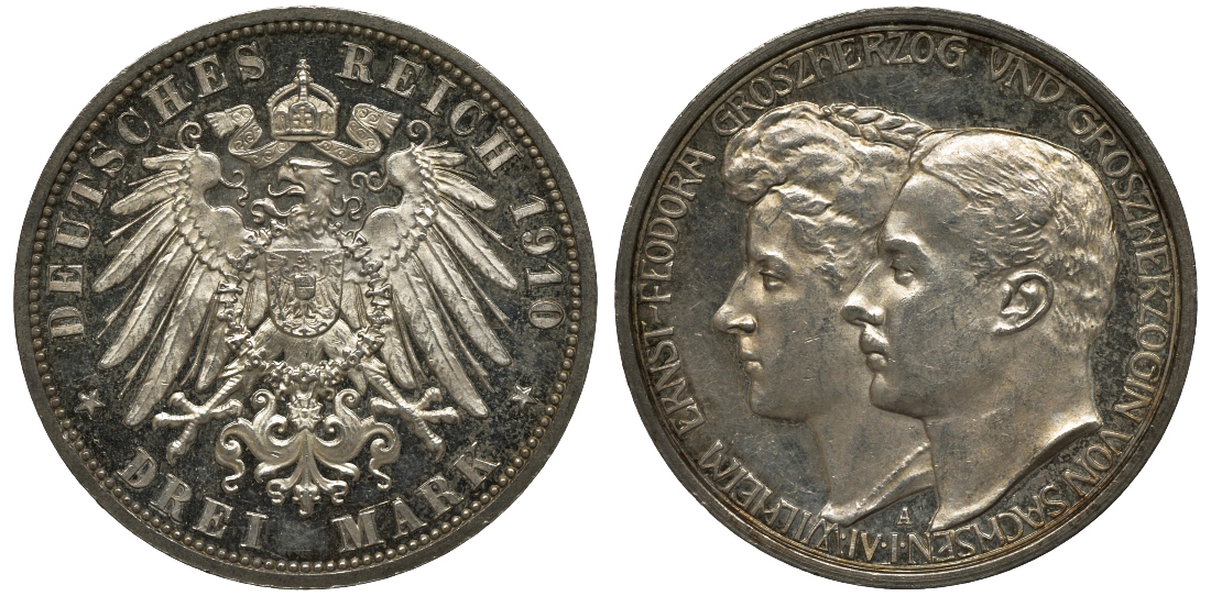 -Саксен-Веймар-Эйзенах 3 марки 1910 А, на вторую свадьбу Вильгельма Эрнста и Феодоры Weege 158, J. 162, KM 176 серебро PROOF 00-816-43Пруссия - PreussenразноеРейс - ReussСаксен-Алтенбург - Sachsen-AltenburgСаксен-Кобург-Гота - Sachsen-Coburg-GothaСаксен-Майнинген - Sachsen-MeiningenСаксония - SachsenШаумбург-Липпе - Schaumburg-LippeШварцбург - SchwarzburgАнгальт - AnhaltМекленбург-СтрелицОльденбург - OldenburgМекленбург-Шверин - Meklenburg-SchwerinЛюбек - LubeckЛиппе - LippeГессен - HessenГамбург - HamburgВюртемберг - WurttembergБремен - BremenБрауншвейг-Люнебург - Braunschweig-LuneburgБаден - BadenБавария - BayrenОбщегерманские номиналы