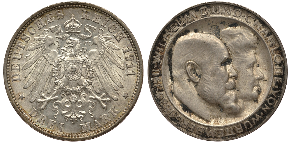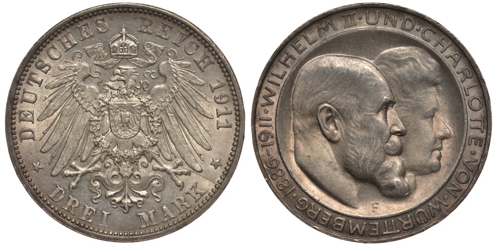 Вюртемберг 3 марки 1911 F, серебрянная свадьба Вильгельма II и Шарлотты Weege 173a, J. 177a, KM 636 серебро UNC 413-4211