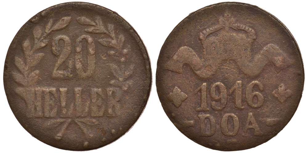 Немецкая Восточная Африка (Танзания) 20 геллеров 1916 T - Ost-Africa, большая корона, буквы LL острые, RRR Jaeger 725 a, KM 15, WK 25 a 00-803-24