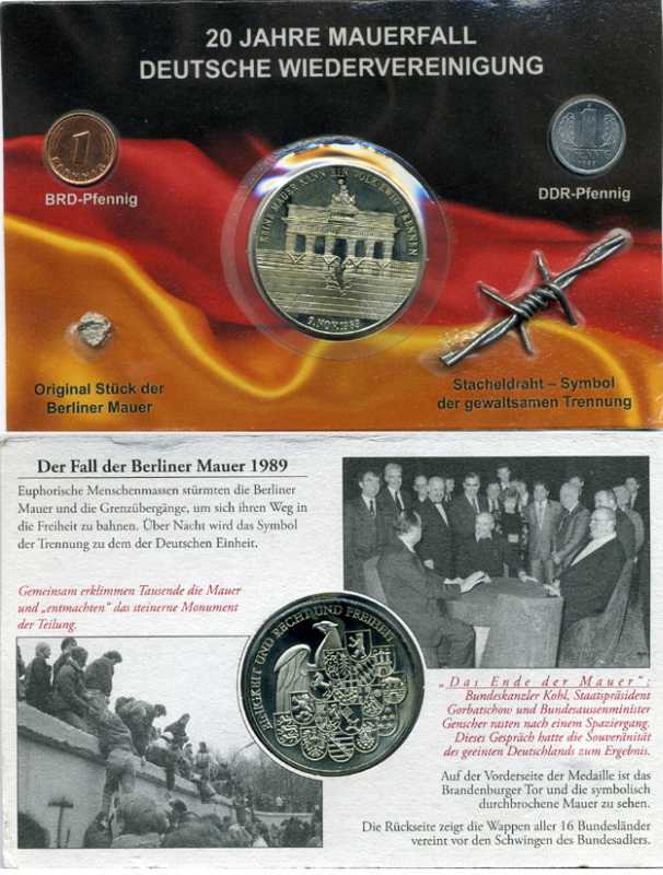 ----Германия набор из 2 монет плюс жетон 2009 оригинальный набор в картонном буклете 20-летие сноса Берлинской стены и народному единству, включает 1 пфенниг ФРГ и 1 пфенниг ГДР, частичку стены и колючей проволоки 3-6-4-33