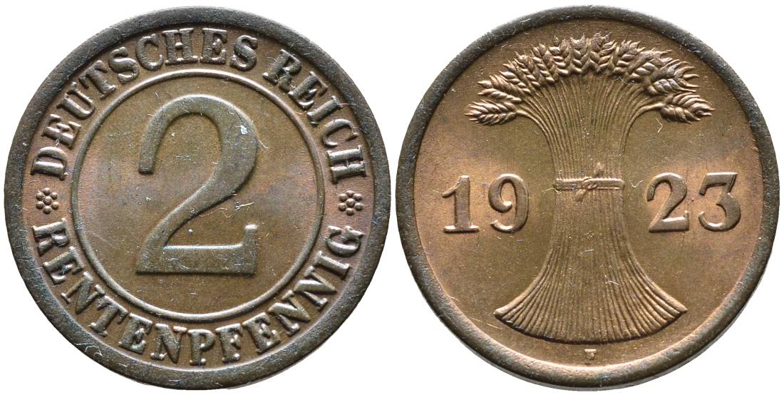 ГЕРМАНИЯ 2 РЕНТЕНПФЕННИГА 1923 F, ВЕЙМАРСКАЯ РЕСПУБЛИКА (1919-1933) KM 31, Jager 307, Weege 3 бронза aUNC 4546-817