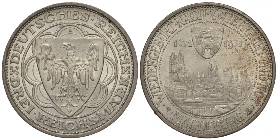 Германия 3 марки 1931 A, 300-летие восстановления Магдебурга J. 347, KM 72 серебро UNC 00-814-76