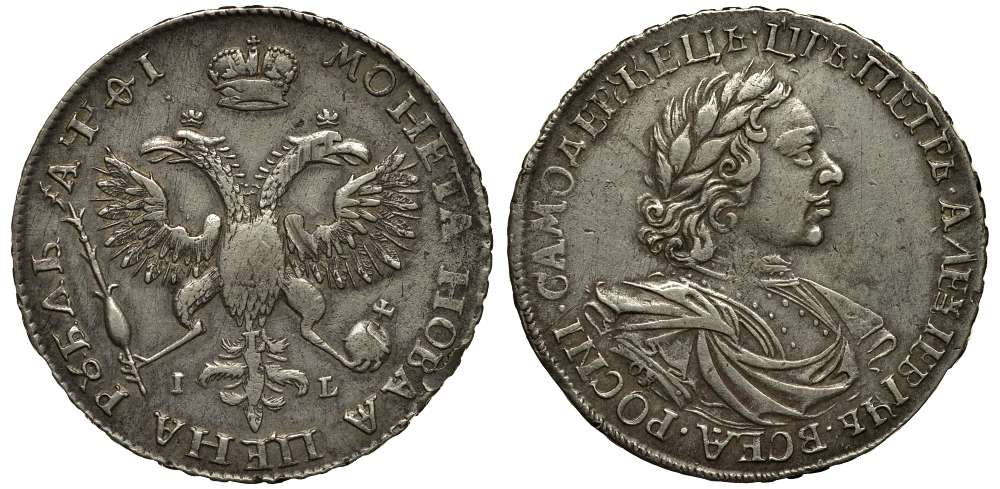 Россия 1 рубль 1719 OK-IL-L, портрет в латах, Красный монетный двор Биткин 824 серебро 10-020-39