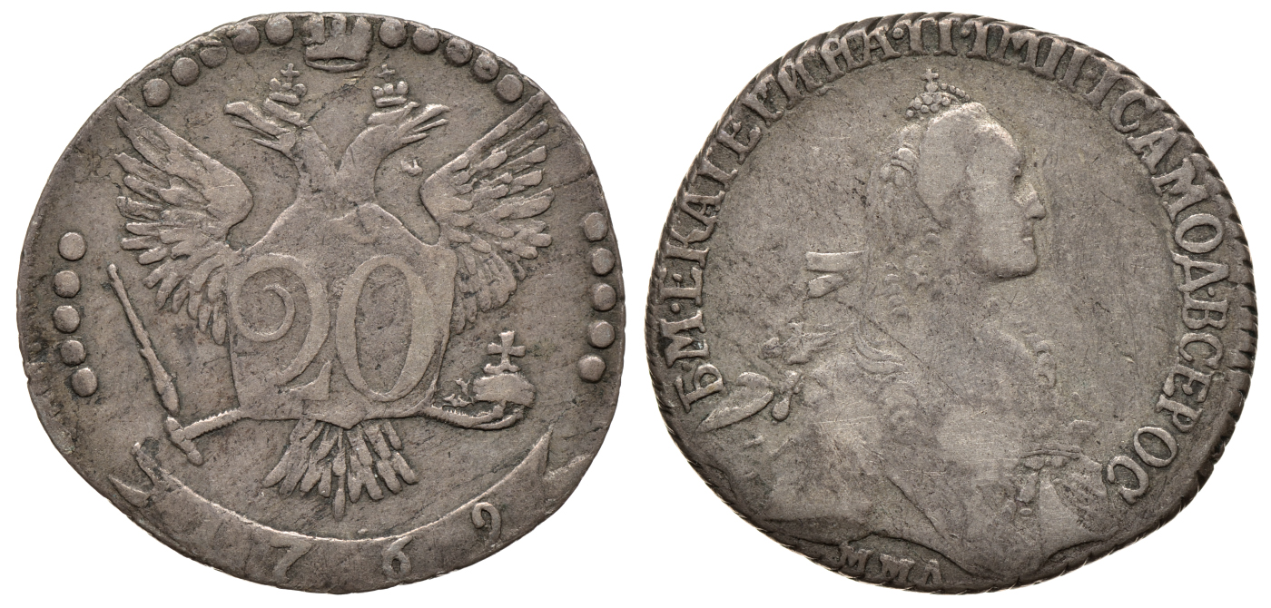 -Россия 20 копеек 1769 ММД, Екатерина II (1762-1796), Красный монетный двор, Ильин 5 рублей, из коллекции Леонида Содермана Биткин 156 (R1), Северин 2024, GM 10.11 серебро 10-002-051741-1761 Елизавета Петровна1881-1894 Александр IIIРазноеМонеты до 1700 года1895 -1917 Николай II1855-1881 Александр II1825-1855 Николай I1801-1825 Александр I1796-1801 Павел I1762 (с 6 января по 28 июля) Петр III1740-1741 Иван III Антонович1730-1740 Анна Иоановна1727-1730 Петр II1725-1727 Екатерина I1689-1725 Петр I Великий