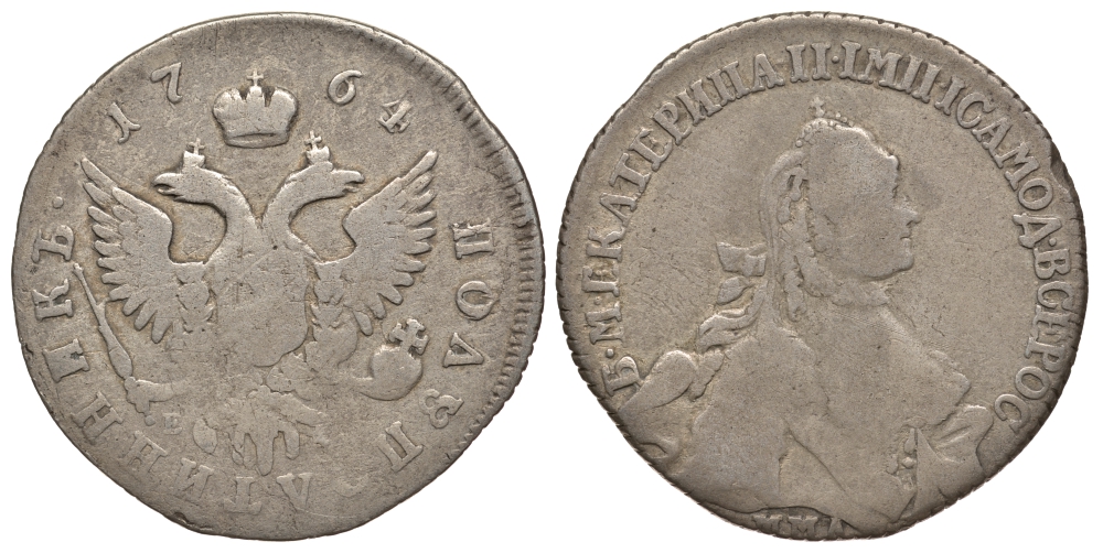 Россия полуполтинник (25 копеек) 1764 ММД-ЕI, Екатерина II (1762-1796), Ильин 15 рублей Биткин 139 R2 серебро 10-016-32