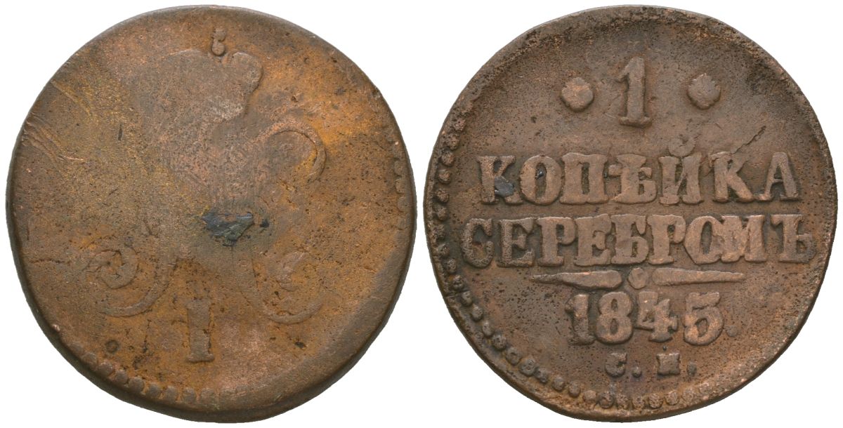 Россия 1 копейка 1845 СМ, Николай I (1825-1855) Биткин 767 медь 92-615