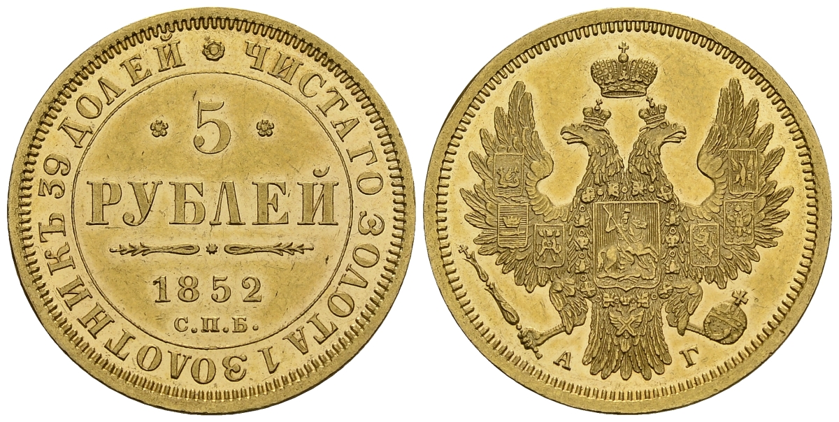Россия 5 рублей 1852 СПБ-АГ, Николай I (1825-1855) Биткин 35 золото UNC 00-000-00