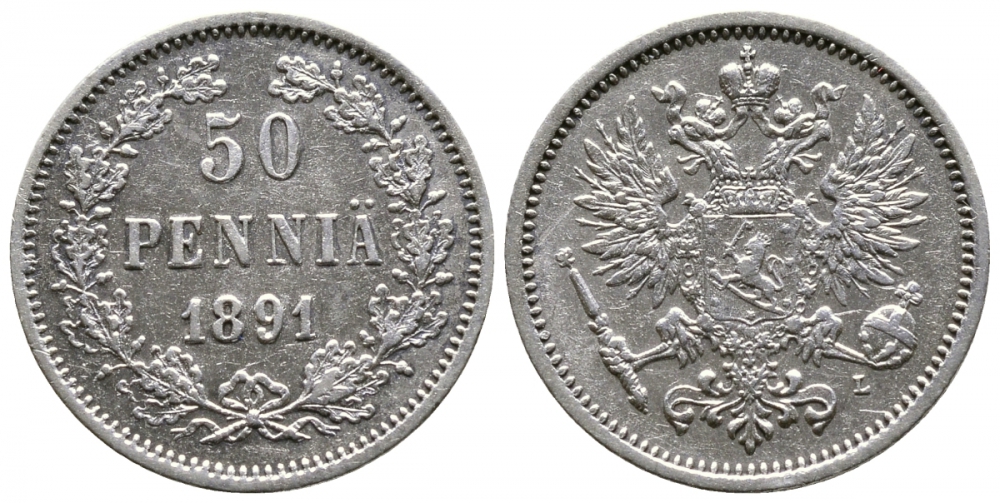 РОССИЯ ДЛЯ ФИНЛЯНДИИ 50 ПЕННИ 1891 L, АЛЕКСАНДР III KM 2.2, Биткин 235 серебро 413-4044