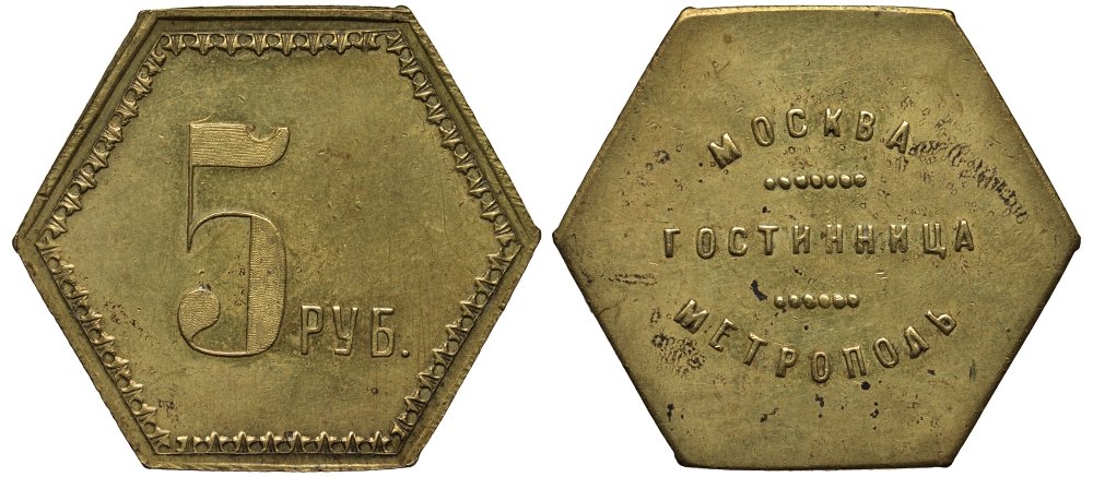 Россия, Москва, Ресторан Метрополь 5 рублей ND (1900-ые), 9,45 гр, 36*32 мм Тункель 589 латунь 1520-613