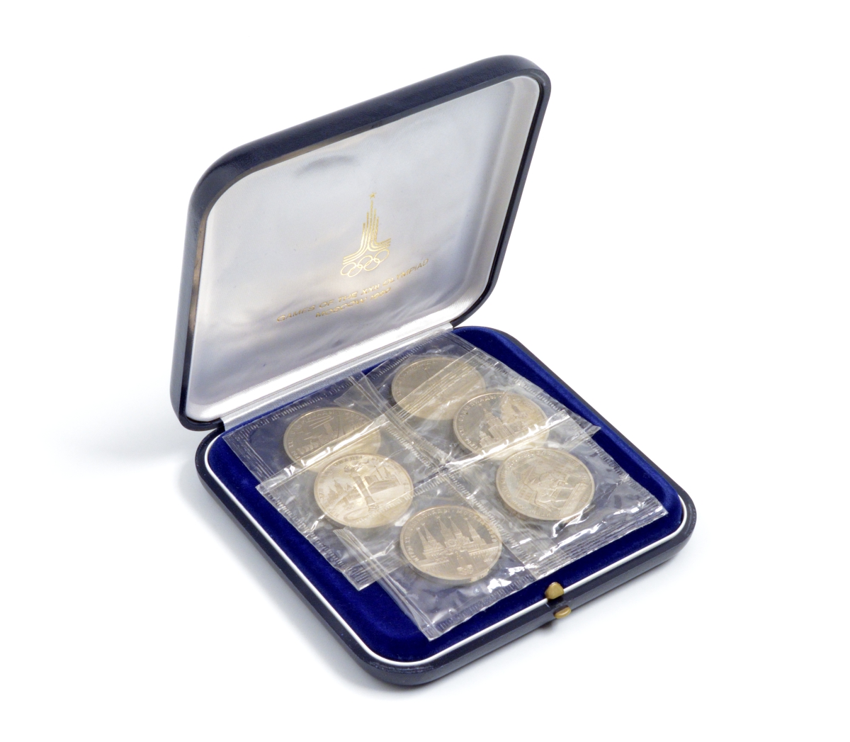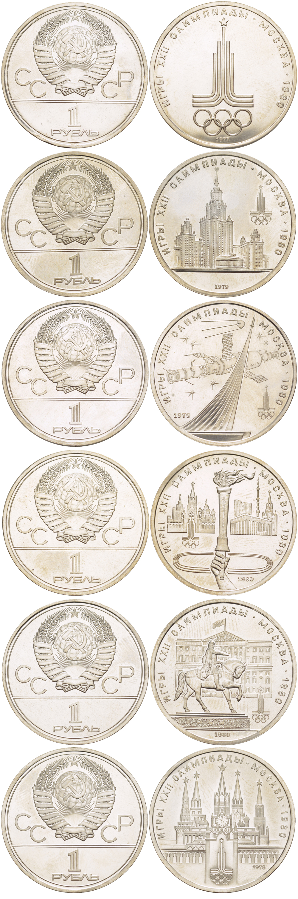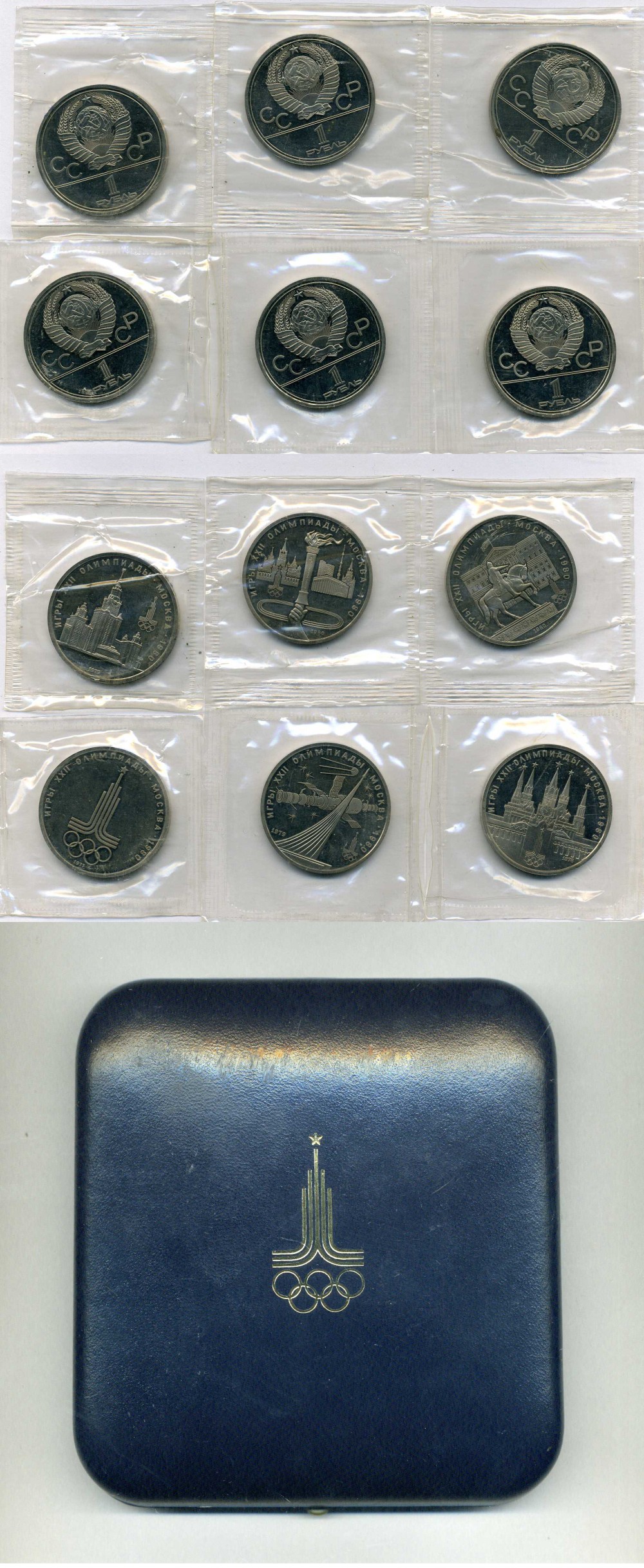 СССР набор из 6 монет по 1 рублю 1977-1980 Олимпиада 80, полный комплект (эмблема, Кремль, спутник, МГУ, факел, Долгорукий), в запайках KM 144, 153.1, 164, 165, 177, 178 медь никель цинк PROOF 2-4-2-48