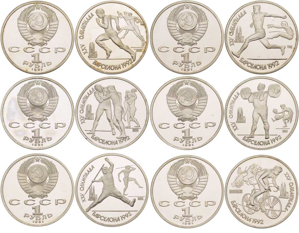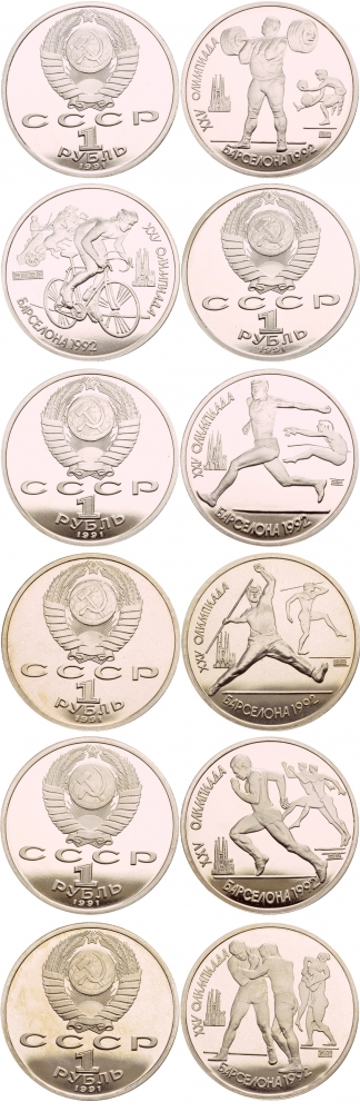 СССР набор из 6 монет по 1 рублю 1991 XXV летние Олимпийские игры в Барселоне 1992 года KM 289, 290, 291, 299, 300, 302 медно-никель PROOF 1074-10-54