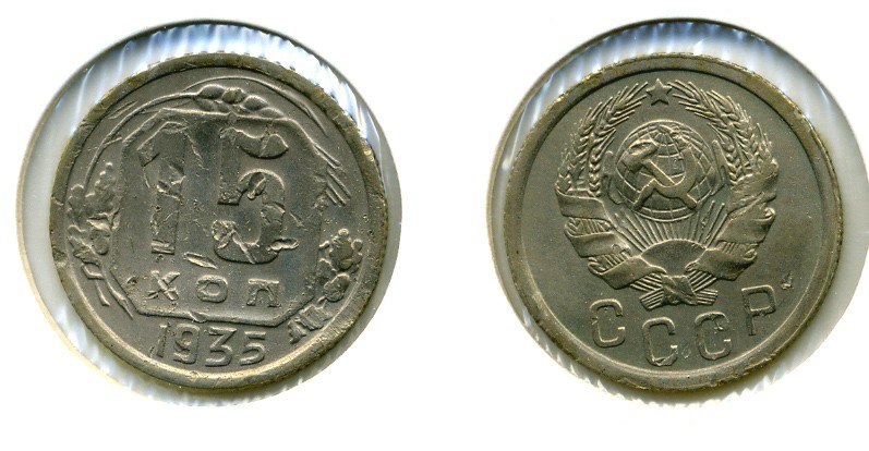 СССР 15 КОПЕЕК 1935 БРАК ЧЕКАНА, БУБОВЫЕ ЛИСТЬЯ СПРАВА ПЕРЕВЕРНУТЫ, ТРИ МЕРИДИАНА, КМ 103 медно-никель 557-241