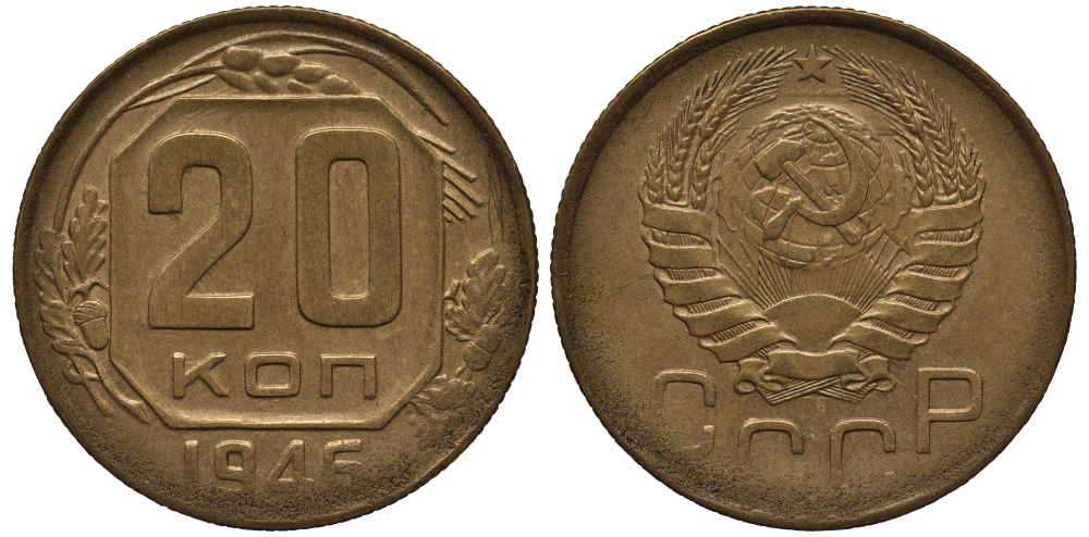 СССР 20 КОПЕЕК 1946 Ошибочный чекан на заготовке из алюминиевой бронзы, вес 2,55 грамм Федорин 007-ДМ, степень редкости Р-4, KM нет алюминиевая бронза 00-000-00