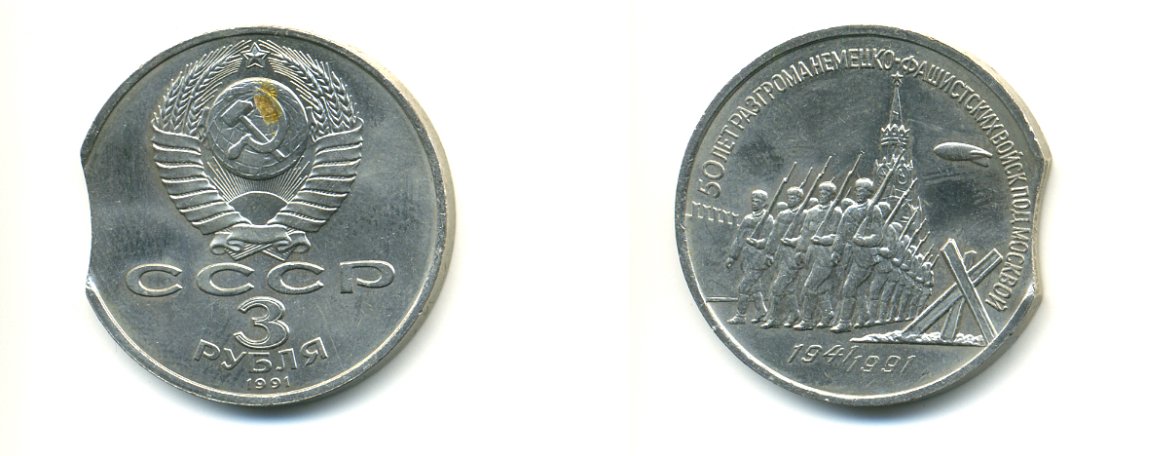 СССР 3 рубля 1991 50 лет разгрома немецко-фашистских войск под Москвой, брак заготовки KM 301 медно-никель UNC 417-111