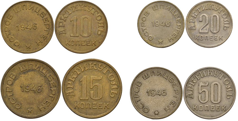 Арктикуголь, остров Шпицберген лот из 4 монет 10, 15, 20 и 50 копеек 1946 KM Tn1, Tn2, Tn3, Tn4 00-00