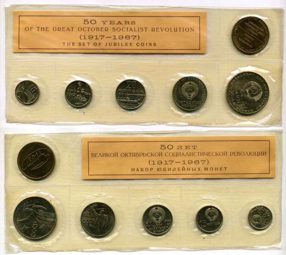 СССР годовой набор из 5 монет + бронзовый жетон, ЛМД Государственного Банка СССР 1967 50 лет Революции 1917 года, улучшенного качества UNC 4294-4-2
