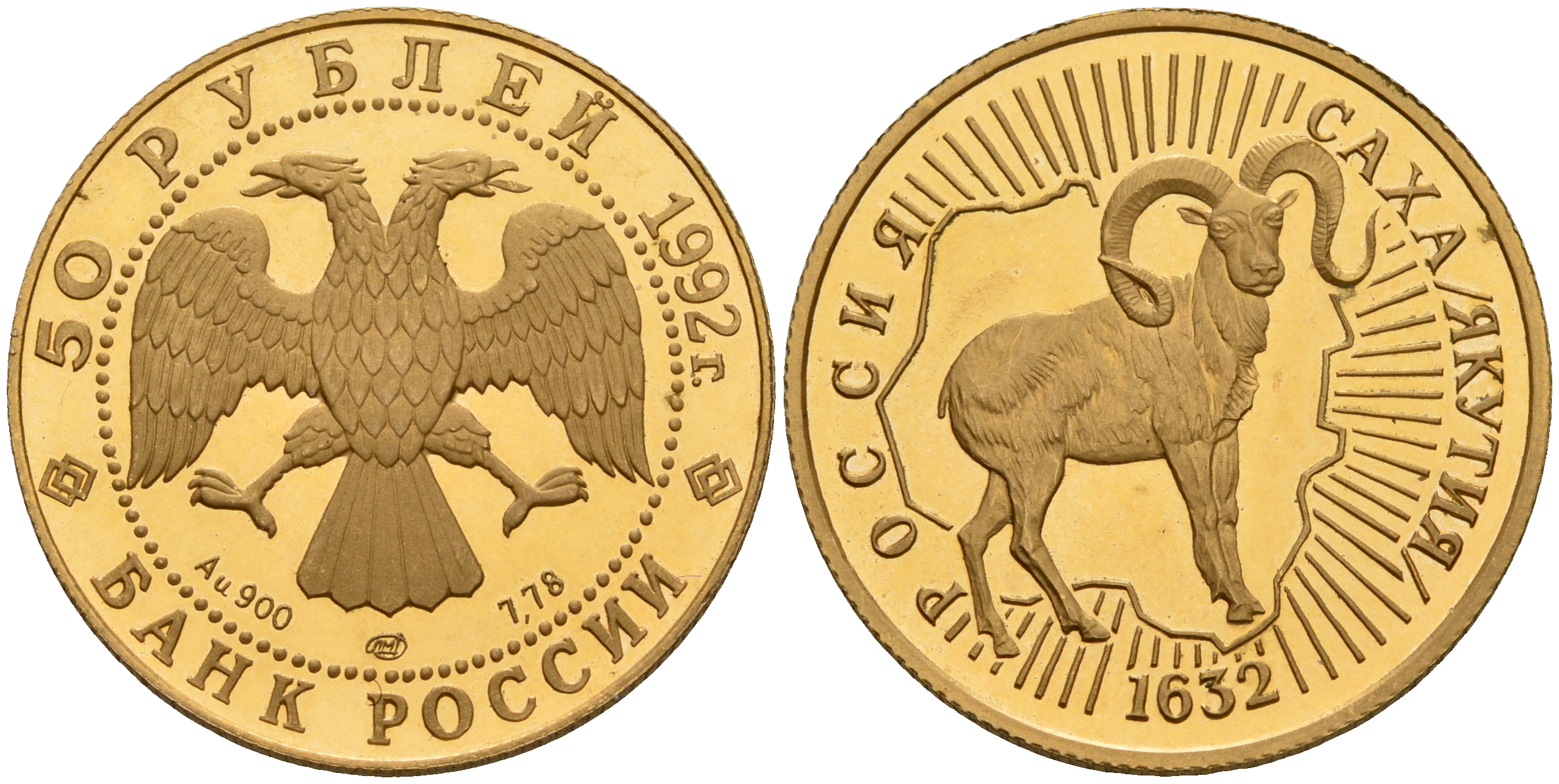 Россия 50 рублей 1992 ЛМД, 360 лет вхождению Якутии в состав России Y 516 золото PROOF 10-020-45