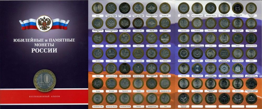 Россия 84 монеты по 10 рублей 2000-2014 полный комплект, в картонном буклете, (Чечня, Ямало-Ненецкий и Пермский край - копии монет) биметалл 14-01-02-07