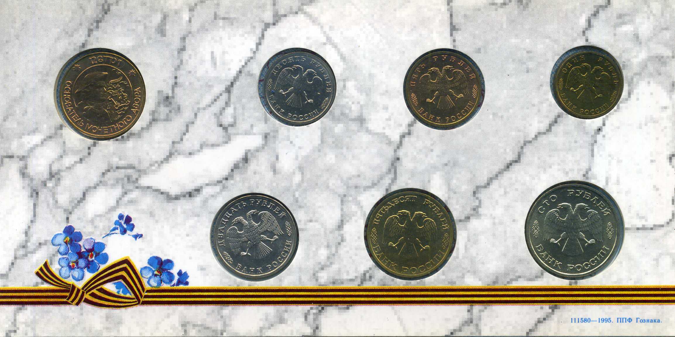 Россия набор из 6 памятных монеты банка России (1, 5, 10, 20, 50 и 100 рублей) и жетона Санкт-Петербурского монетного двора 1995 1-4-1-02