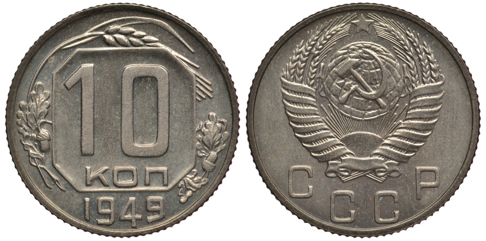 СССР 10 копеек 1949 чекан специального качества, "хрущевский новодел" Петров, Федорин 167 Р-2 медно-никель UNC 10-020-17