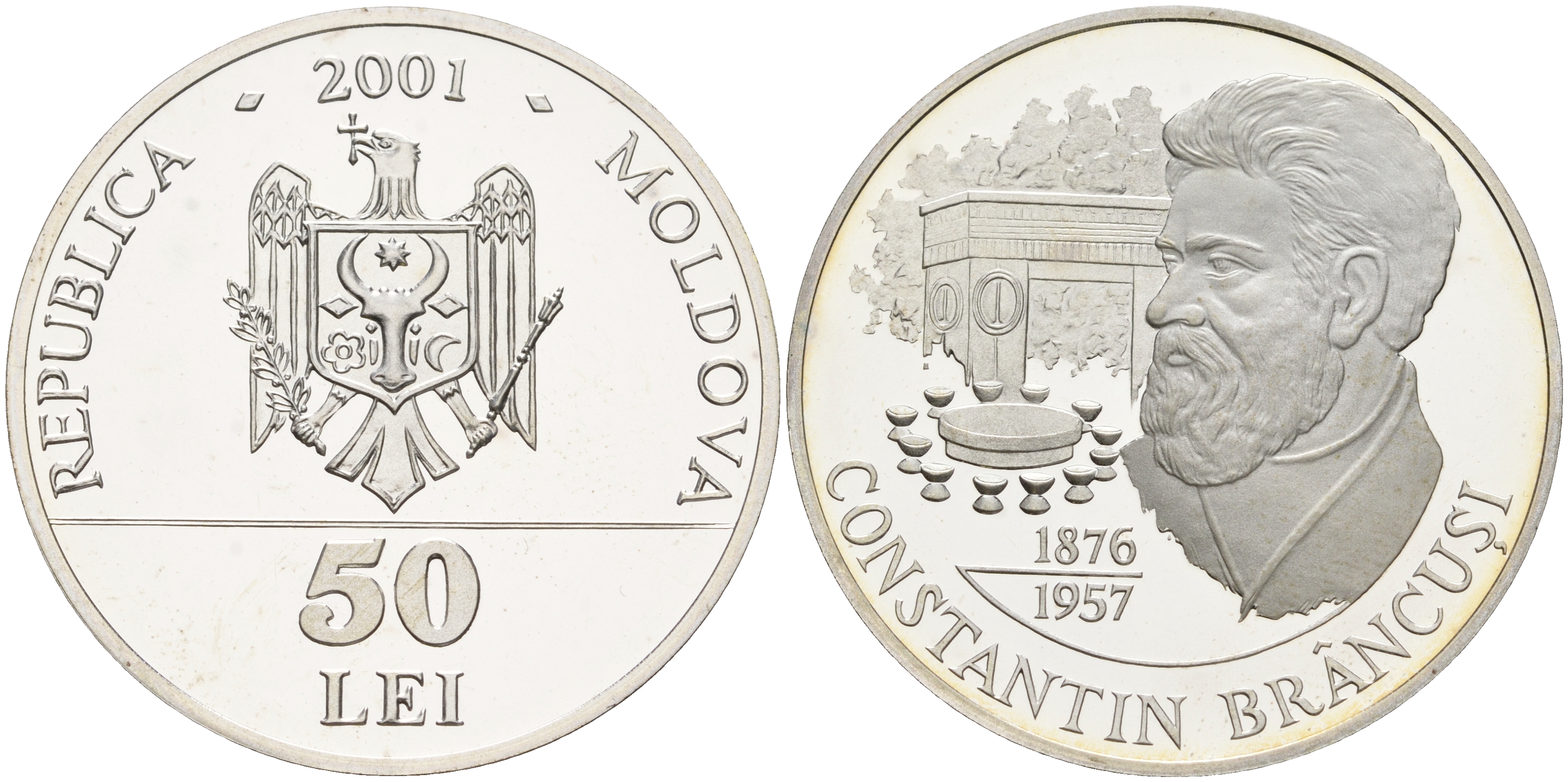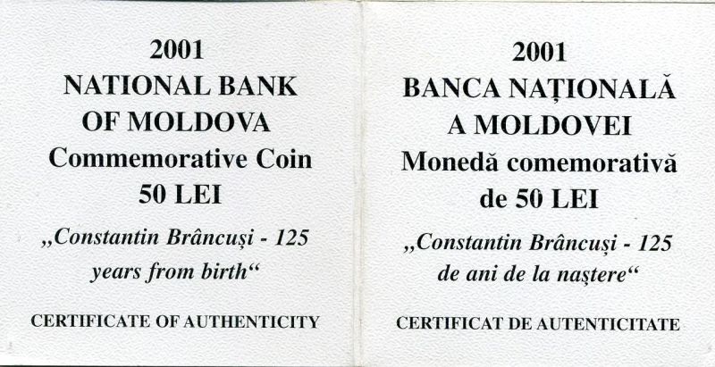 -----Молдова 50 лей 2001 125 лет со дня рождения Константин Бранкузи, тираж 1000 экземпляров, оригинальная коробка, сертификат серебро 7-6-1-40