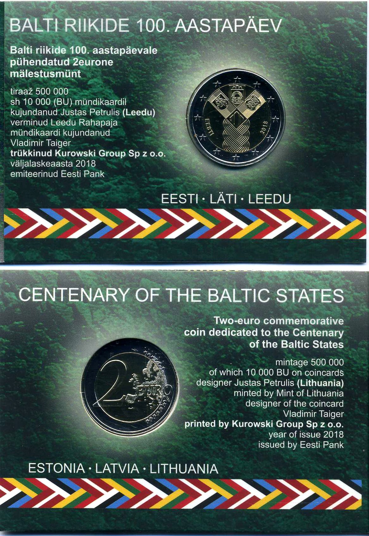 -----Эстония 2 евро 2018 100 лет государствам Балтики, запайка, буклет KM 103 биметалл BUNC 3-4-8-28