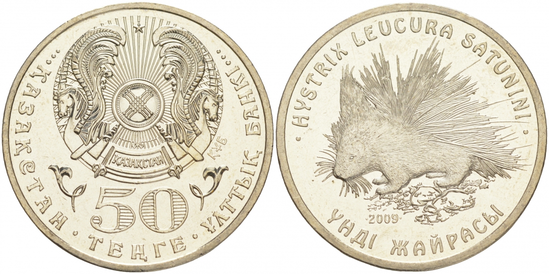 Казахстан 50 тенге 2009 серия Красная книга - дикобраз KM 141 нейзильбер UNC M25-21