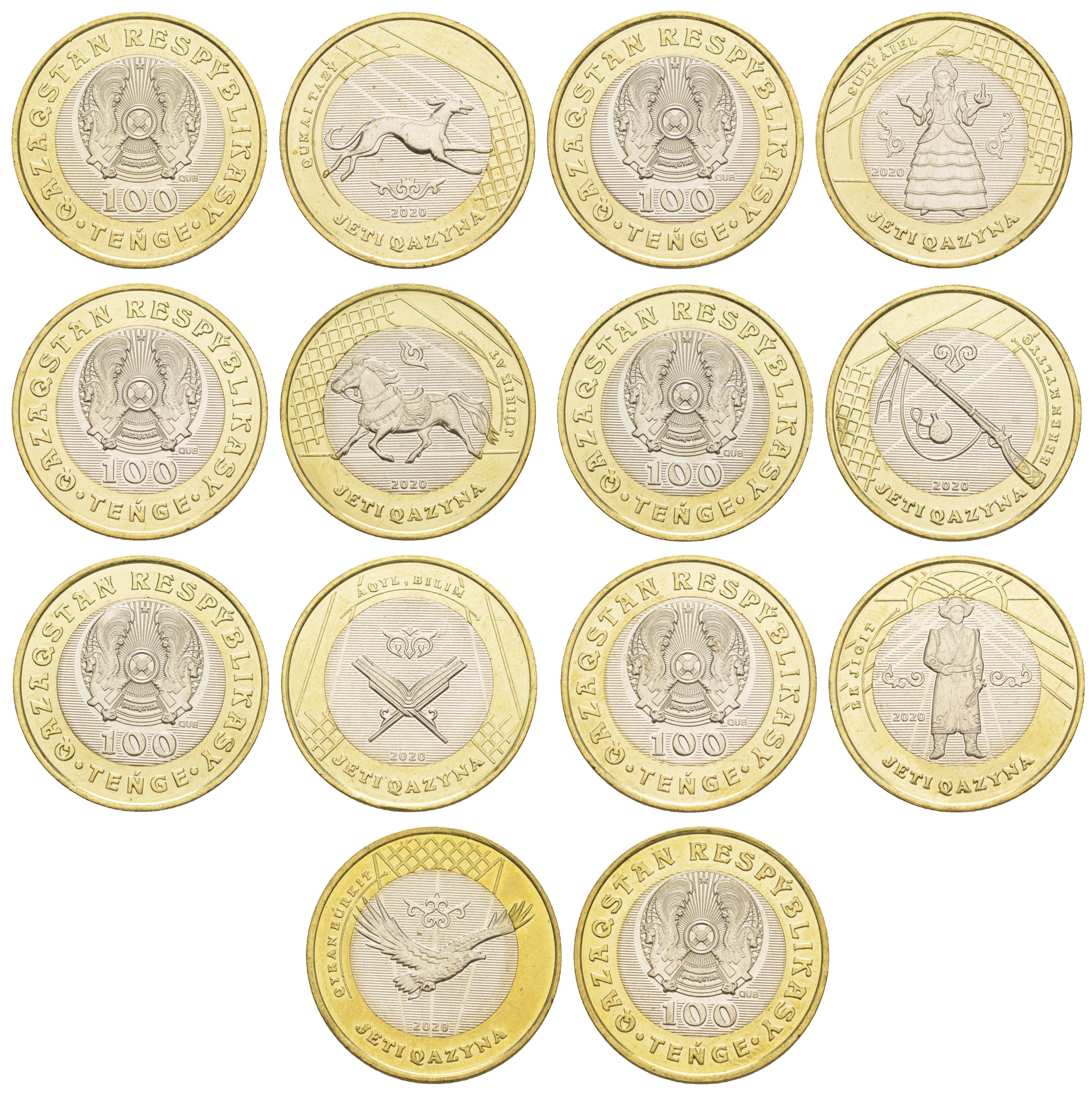-----Казахстан лот из 7 монет номиналом 100 тенге 2020 серия семь сокровищ казахского народа KM NEW биметалл UNC M67-21