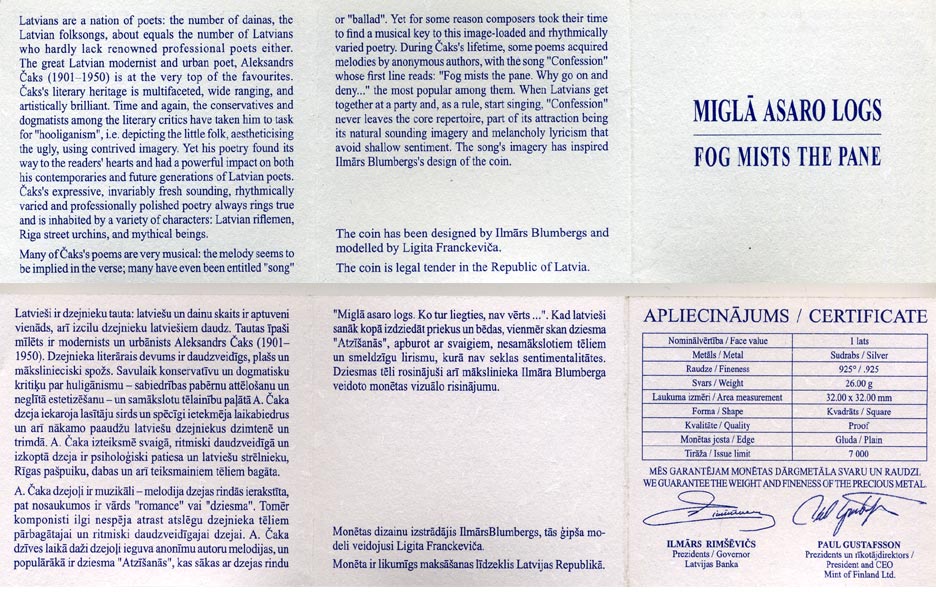 Латвия 1 лат 2011 Александр Чак, Квадрат серебро PROOF 2-5-2-19