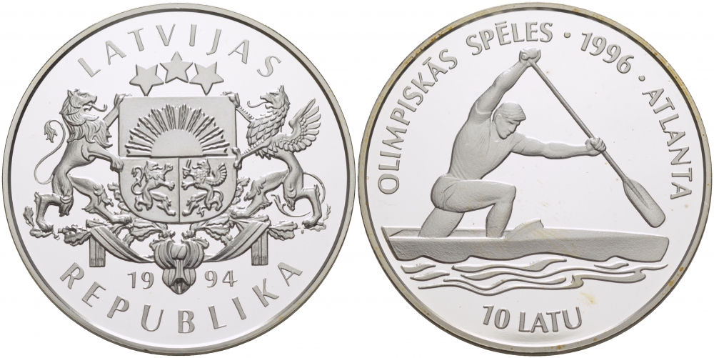 Латвия 10 латов 1994 XXVI летние Олимпийские игры в Атланте 1996 год, гребля на каноэ KM 24 серебро PROOF 04-174-32