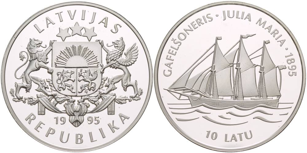 ЛАТВИЯ 10 ЛАТОВ 1995 ПАРУСНИК "JULIA MARIA", ПРОБА 925, ВЕС 31,47 ГР., ТИРАЖ 20000 ЭКЗ. KM 252 серебро PROOF 1081-7-13
