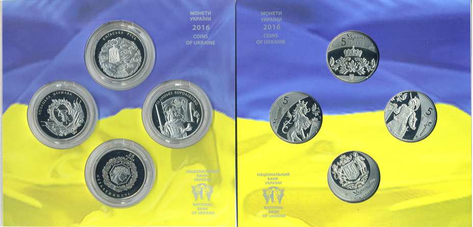 -----Украина набор из 4 монет по 5 гривен 2016 официальный набор госбанка Украины, 25 лет независимости Украины (Киевская Русь, Козацкая держава, Галицкое королевство, 25 лет независимости), монеты в капсулах в оригинальном картонном буклете BUNC 3-6-4-65