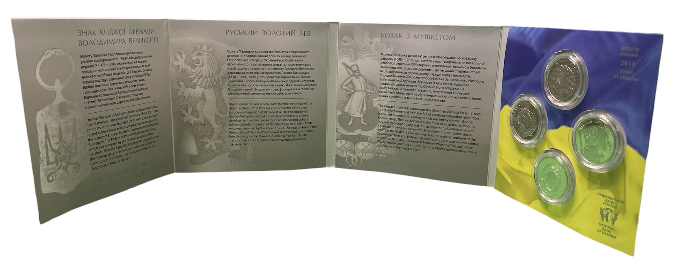Украина набор из 4 монет по 5 гривен 2016 официальный набор госбанка Украины, 25 лет независимости Украины (Киевская Русь, Козацкая держава, Галицкое королевство, 25 лет независимости), монеты в капсулах в оригинальном картонном буклете BUNC 3-6-4-65