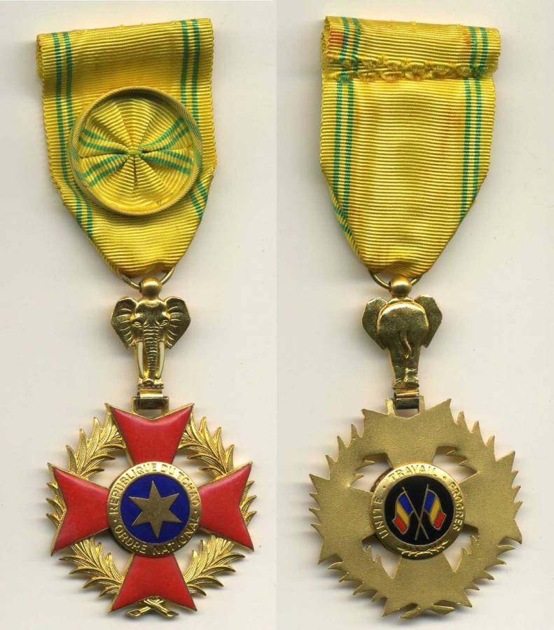 Национальный орден Чада [орден Национального Чада]. Крест офицера, золоченой бронзы и эмали, эмали ремонт почти невидимым в Kreuzarmspitze на ленте с розеткой применяются. VPE2 стр. 457f, II низших классов этого приказа еще не распространены в Европе, чтобы найти гораздо реже, чем более высокие. - ордена за заслуги общим Автономной Республики незадолго до достижения полной независимости (11 августа 1960) Указ № 71 от 12 Апреле 1960 года, пожертвовал подзаконные акты были с указом № 118/PG двадцать первый Июль 1960 вопроса. Он научился менять с указами № 14 148/PR Август 1963 года и № 348/PR от 22 Август 1969.орден имеет три уровня (командир, офицер и рыцарь) и два достоинства (Кавалер Большого креста и). Как внешний признак его достоинства в качестве господствующей Великий магистр носит президент один ошейник.