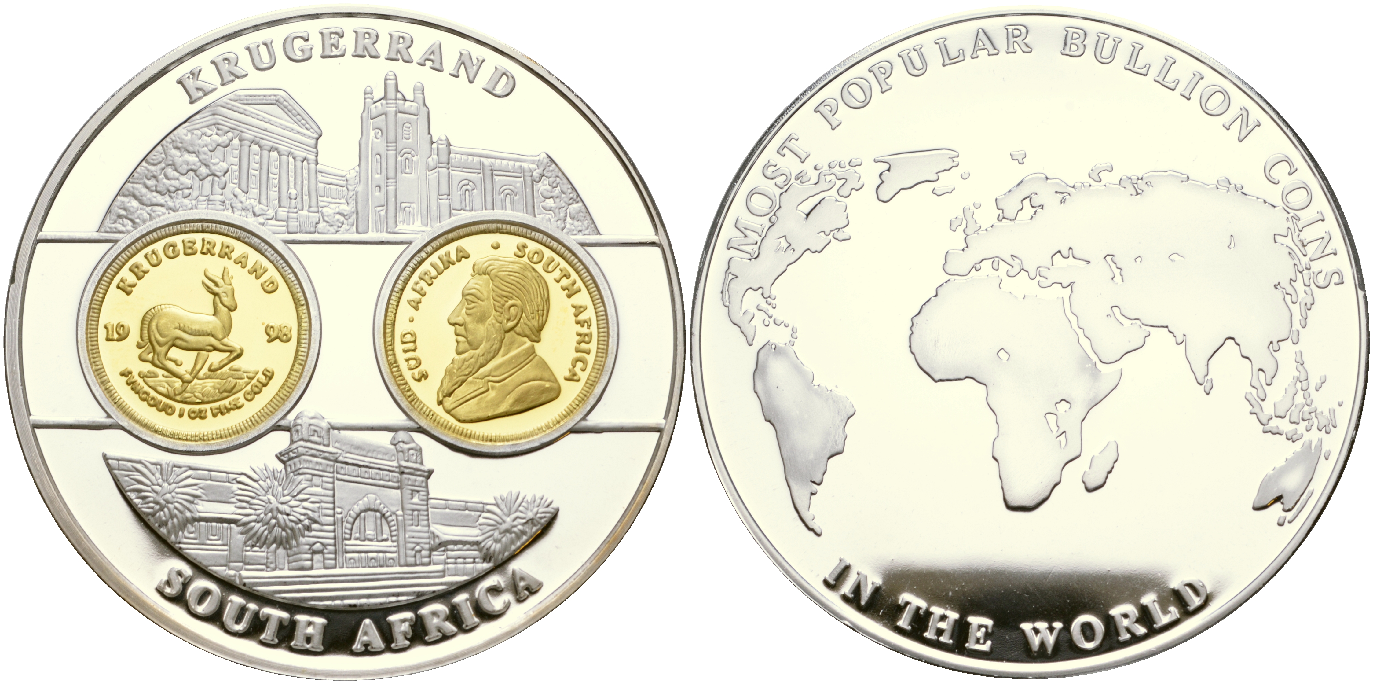 ЮАР медаль 1998 серия самые известные монеты мира, золотой крюгеранд сертификат, диаметр 50 мм. посеребренный медно-никель PROOF 1066-10-32
