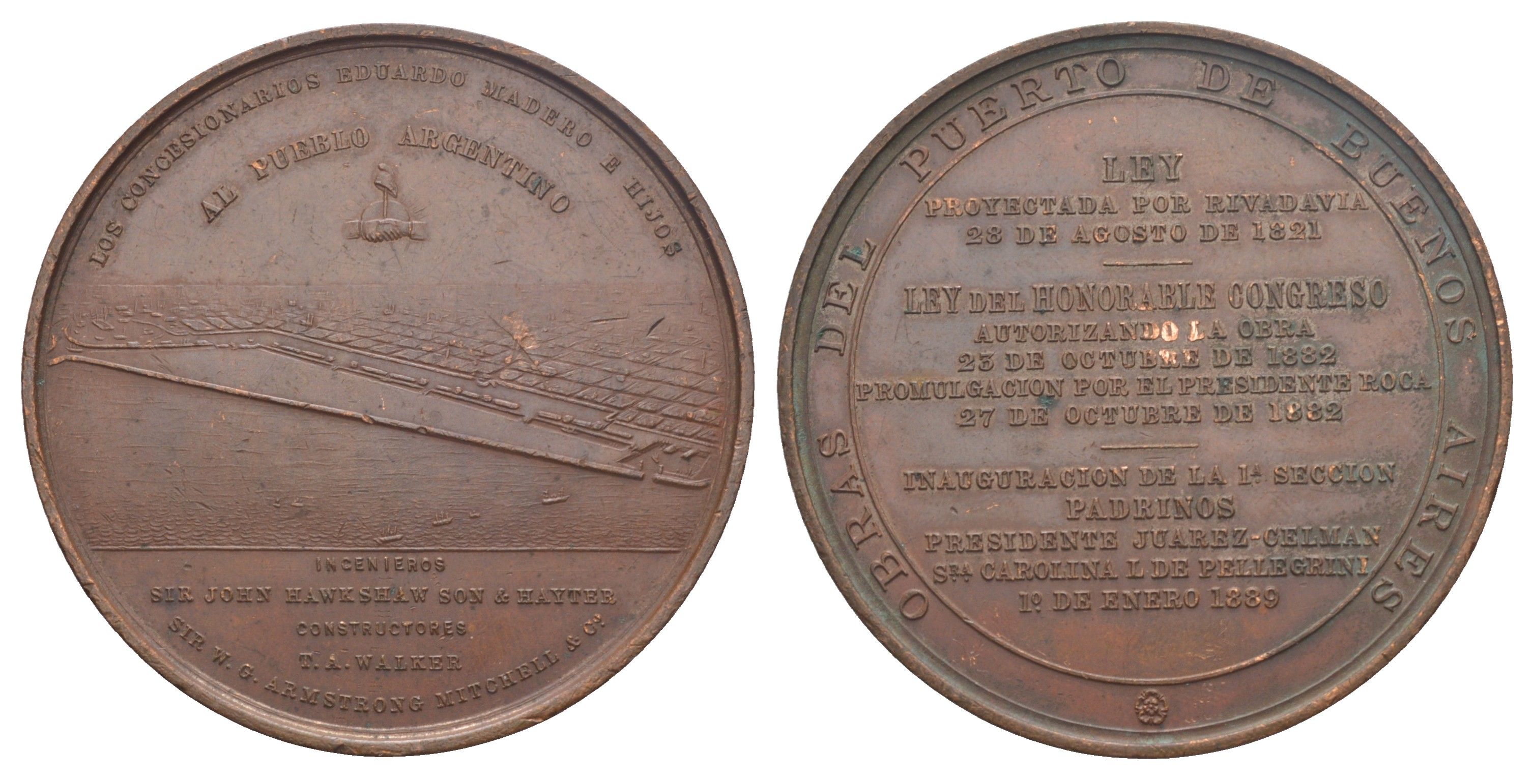 -----Аргентина медаль "Порт Буэнос-Айреса - Пуэрто-Мадеро" 1889 диаметр 60 мм, вес 105,6 гр бронза 11-160-11-4