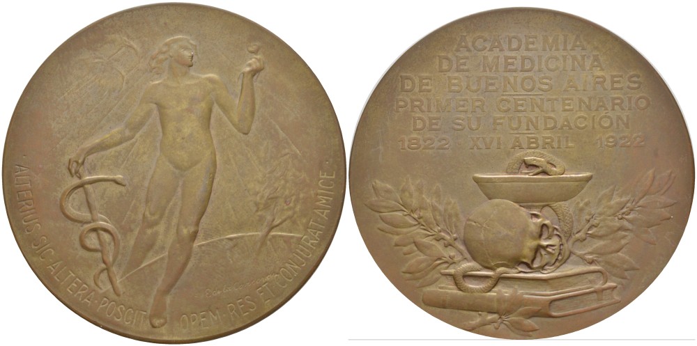 -----Аргентина медаль 1922 100 лет медицинской академии Буэнос-Айрес, основанной 16 апреля 1822 года, диаметр 56,5 мм. бронза 1089-3-41