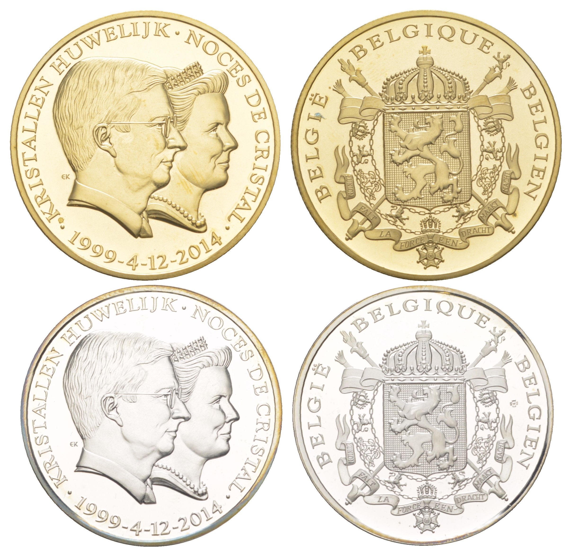 ------Бельгия подарочный набор из 2 медалей и 1 значка посвященная хрустальной свадьбе Филиппа I 2014 1 медаль - диаметр 37 мм, вес 22,85 гр, серебро; 2 медаль - диаметр 38,6 мм, вес 26 гр, серебро плакированная золотом; в красочной упаковке, дерево, с сертифик