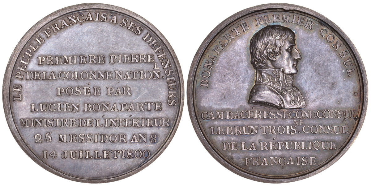 Франция медаль 1800 народ Франции своим защитникам, первый камень заложен в основание колонны министром внутренних дел Люсьеном Бонапартом… Наполеон первый консул, Камбассере второй консул, Лебрен третий консул, 32,7 гр., диаметр 42 мм серебро 10-010-74